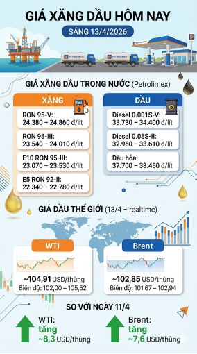 - Ngày 13/4/2026: 104,91 USD/thùng