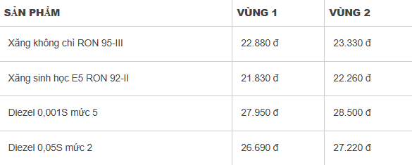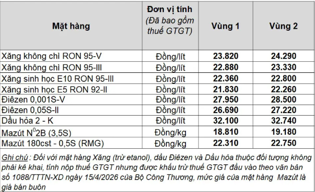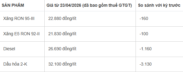 Ghi nhận sau phiên điều chỉnh lúc 15h00 ngày 23/4/2026, cơ quan quản lý đã đồng loạt hạ giá tất cả các mặt hàng nhiên liệu. Mức giá cụ thể được các doanh nghiệp kinh doanh xăng dầu áp dụng như sau: