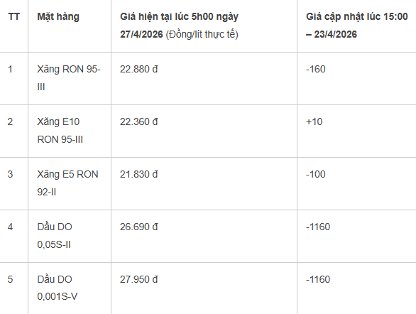 Giá xăng dầu trong nước hôm nay 27/4/2026 ghi nhận lúc 5h00