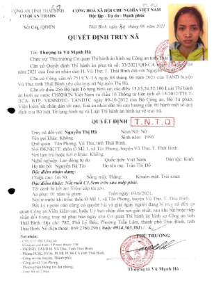 Theo quyết định truy nã Nguyễn Thị Hà bị Tòa án nhân dân khu vực 5 (huyện Vũ Thư cũ) tuyên phạt 1 năm tù giam. Tuy nhiên, đối tượng đã bỏ trốn từ ngày 03/6/2021 và hiện không có mặt tại địa phương. Đặc điểm nhận dạng của Nguyễn Thị Hà: cao khoảng 1m50, khuôn mặt trái xoan, sống mũi thẳng, có nốt ruồi kích thước khoảng 1,5 cm phía sau mép phải.