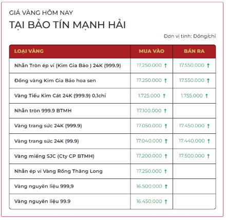 Lúc 9h30, giá vàng SJC tại Bảo Tín Mạnh Hải, Bảo Tín Minh Châu, Công ty SJC, DOJI, PNJ đều đã đồng loạt lên mức 172,0 – 175,0 triệu đồng/lượng. Theo đó, giá vàng miếng đã tăng 5 triệu đồng/lượng so với hôm qua và tăng 13 triệu đồng/lượng so với đáy ngày 23/3.