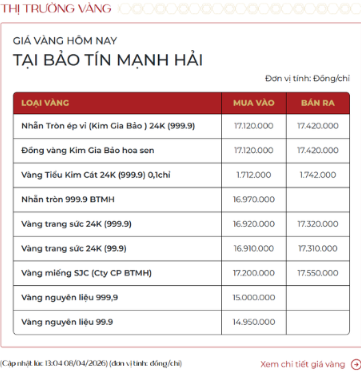 Cùng thời điểm, Bảo Tín Minh Châu và Bảo Tín Mạnh Hải niêm yết giá vàng nhẫn tròn trơn ở vùng 171,2 – 174,2 triệu đồng/lượng. Ở chiều ngược lại, Mi Hồng hạ giá vàng nhẫn 200.000 đồng ở chiều mua vào xuống còn 171 triệu đồng/lượng và giảm 500.000 đồng ở chiều bán ra xuống còn 173 triệu đồng/lượng.