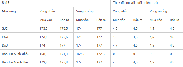 Cụ thể, vàng miếng tại SJC, PNJ, DOJI và Bảo Tín Mạnh Hải cùng được niêm yết ở mức 174 – 177 triệu đồng/lượng (mua vào – bán ra), tăng 4,5 triệu đồng/lượng ở cả hai chiều so với phiên trước.