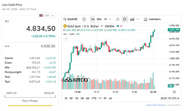 Trên thị trường quốc tế, giá vàng giao ngay ghi nhận lúc 6h50 giao dịch ở mức 4.835 USD/ounce, tăng mạnh 2,75% so với mức đóng cửa hôm qua.