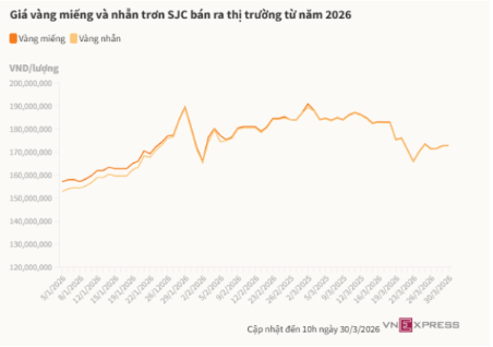 Bước sang phiên đầu tuần mới ngày 30/3, thị trường nhanh chóng cho thấy sự mong manh của đà phục hồi. Giá vàng giao ngay có thời điểm giảm gần 70 USD, tương đương 1,2%, xuống dưới 4.430 USD/ounce, sau đó lại bật lên vượt 4.500 USD/ounce. Trong nước, vàng SJC và vàng nhẫn vẫn ở quanh ngưỡng 170-173 triệu đồng/lượng.
