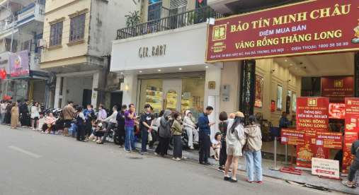 Cửa hàng Bảo Tín Minh Châu thông báo, thời điểm buổi sáng mở cửa giao dịch, cửa hàng bán ra tối đa 2 lượng vàng nhẫn/người. Khách hàng mua từ 3 chỉ trở lên sẽ nhận giấy hẹn đến ngày 6/4 quay lại nhận vàng. Tuy nhiên, do số lượng khách hàng đến mua quá lớn, cửa hàng khoảng 10 giờ phải thông báo tạm hết hàng, phải dừng bán.
