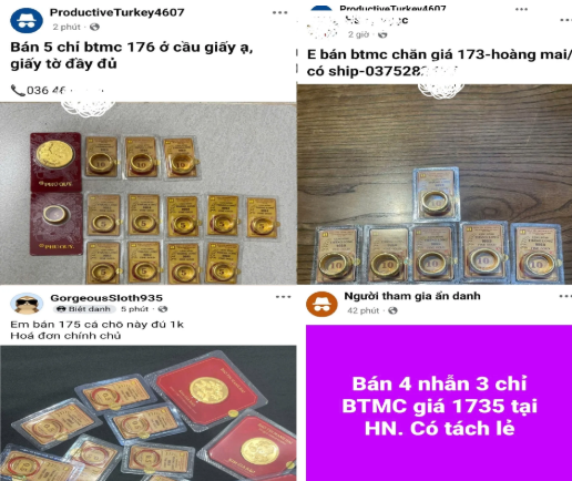 Đáng chú ý, thị trường chợ đen hôm nay 21/3 lại “dậy sóng” do tình trạng khan hiếm của các sản phẩm vàng gia tăng. Trên các hội nhóm Facebook, hàng loạt thông tin rao bán, tìm mua xuất hiện với mức giá “trên trời”. Cụ thể, giá vàng nhẫn Bảo Tín Minh Châu bán ra giao động từ 173 – 176 triệu đồng/lượng, cao hơn giá niêm yết bán ra tại cửa hàng từ 900.000 – 3,9 triệu đồng/lượng và cao hơn giá niêm yết mua vào từ 3,9 – 6,9 triệu đồng/lượng.