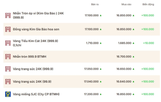 Bảo Tín Mạnh Hải niêm yết vàng miếng cùng mức 168,5 – 172,0 triệu đồng/lượng; vàng nhẫn trơn 168,5 – 171,0 triệu đồng/lượng.