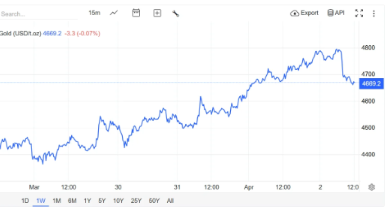 Giá vàng thế giới giao ngay trên thị trường châu Á lúc 12 giờ 15 phút hôm nay ngày 2/4 (giờ Việt Nam) giao dịch ở quanh ngưỡng 4.669 USD/ounce, giảm mạnh 128 USD/ounce so với đầu giờ sáng nay.