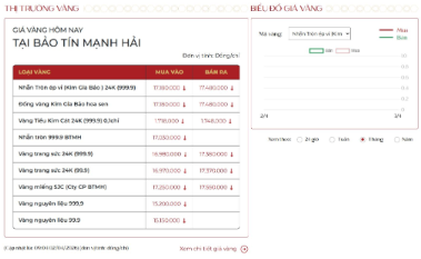 Tại Bảo Tín Mạnh Hải (Cập nhật lúc 09:04): Giá vàng tại đây ghi nhận xu hướng giảm đồng loạt: