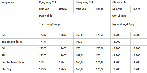 Cụ thể, vàng miếng các thương hiệu SJC, Bảo Tín Mạnh Hải, PNJ, DOJI, Phú Quý đều mua vào ở mức 170 triệu đồng/lượng – bán ra 173,5 triệu đồng/lượng; giảm 3,7 triệu đồng/lượng chiều mua vào và giảm 3,2 triệu đồng/lượng chiều bán ra so với sáng qua.