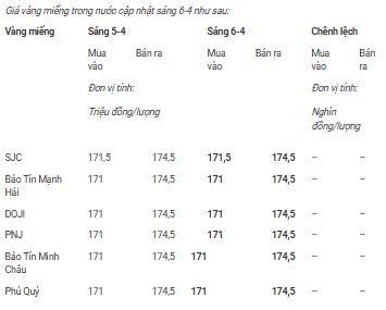Các thương hiệu Bảo Tín Mạnh Hải, DOJI, PNJ, Bảo Tín Minh Châu, Phú Quý cùng giao dịch vàng miếng ở mức 171 – 174,5 triệu đồng/lượng (mua vào – bán ra), đi ngang so với hôm qua.