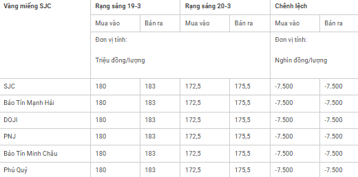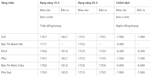 Giá vàng miếng trong nước cập nhật sáng 20-3 như sau: