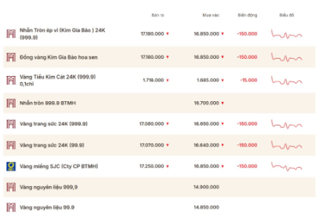 Cùng thời điểm, Tập đoàn DOJI niêm yết giá vàng mua vào – bán ra ở mức 169,8 – 172,8 triệu đồng/lượng, giảm 200.000 đồng/lượng ở chiều mua vào và giảm 700.000 đồng/lượng ở chiều bán ra so với phiên giao dịch liền trước. Chênh lệch giá mua – bán vàng DOJI đang là 3 triệu đồng/lượng.