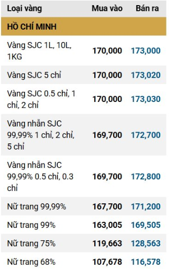 Vàng SJC tại Hà Nội và vàng SJC tại Đà Nẵng: 170,5 triệu đồng/lượng mua vào (tăng 2 triệu đồng/lượng so với giá hôm qua), 173 triệu đồng/lượng bán ra (tăng 1,5 triệu đồng/lượng so với giá hôm qua