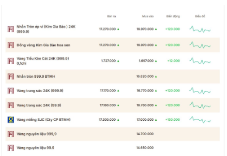 Vàng SJC Bảo Tín Mạnh Hải: 170 triệu đồng/lượng mua vào, 173 triệu đồng/lượng bán ra.