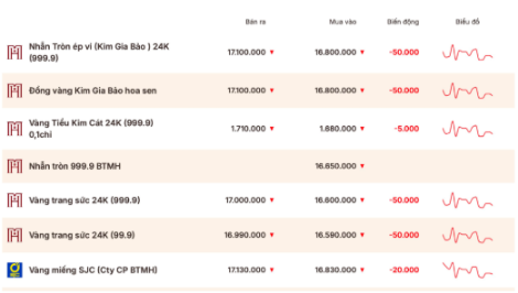 Giá vàng nhẫn hôm nay cũng đồng loạt giảm, mức giảm cao nhất 700.000 đồng/lượng và không đồng nhất giữa các thương hiệu; mức niêm yết giá cao nhất là 171,3 triệu đồng/lượng bán ra, bằng giá vàng miếng.