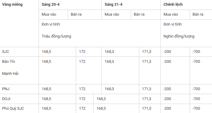 Giá vàng miếng trong nước cập nhật 5 giờ 30 phút sáng 21-4 như sau