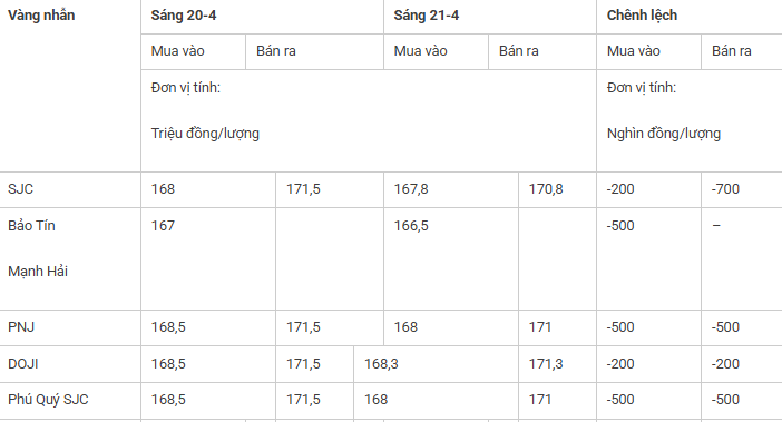 Báo Quân đội nhân dân cũng đăng tải bài viết với tiêu đề: “Giá vàng hôm nay (21-4): Giá vàng trong nước đồng loạt giảm”, nội dung như sau: