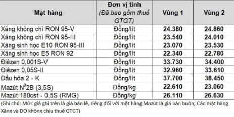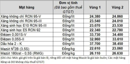 + Kho Bắc Ninh: Dầu Diesel 0,05S: 650 đồng/lít; Xăng RON 95 – III: 50 đồng/lít.