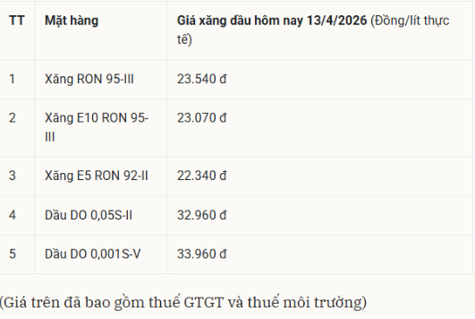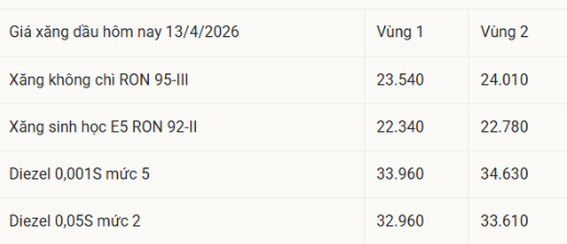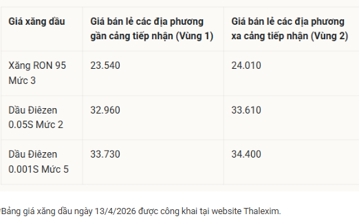 Giá xăng dầu hôm nay 13/4/2026, bảng giá xăng dầu hôm nay 13/4/2026 tại Petrolimex, PVOIL, Mipecorp, Thalexim.