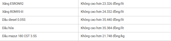 – Giá dầu mazut 180CST 3.5S tăng 1.503 đồng/kg so với giá bán tối đa hiện hành, giá bán lẻ không cao hơn 21.748 đồng/kg.