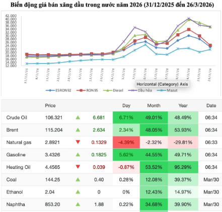 Do 2 ngày giá dầu thô tăng mạnh trở lại khiến bình quân giá dầu tháng 3 so với tháng liền kề trước đó tăng rất mạnh lên 48-49%. So với cùng kỳ năm trước, dầu thô có mức tăng từ 49-54%. Mức giá dầu thô neo cao, tăng liên tục phản ánh biến động từ chiến sự Trung Đông, đặc biệt đường vận chuyển dầu thô qua eo biển Hormuz của Iran.