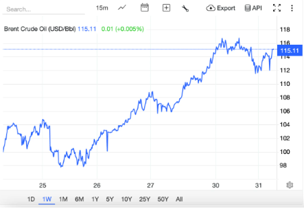 Trading Economics nhận định, giá dầu Brent kỳ hạn đã tăng lên khoảng 115 USD/thùng vào thứ Ba, hướng tới mức tăng kỷ lục hàng tháng gần 70% khi cuộc xung đột ở Trung Đông không có dấu hiệu giảm bớt và tiếp tục làm gián đoạn thị trường năng lượng toàn cầu.