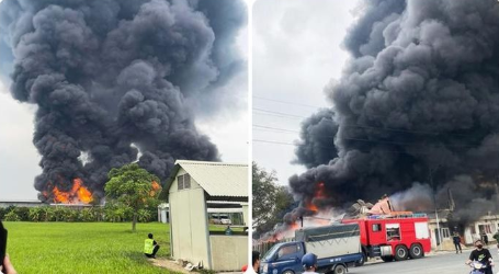 Khói đen cuồn cuộn bốc cao, bao trùm khu nhà xưởng