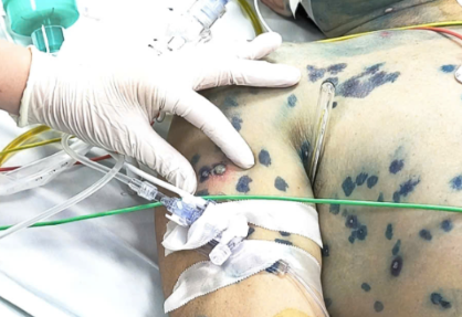 Khoảng 10 ngày trước khi nhập viện, anh xuất hiện tình trạng đau quặn bụng, bí trung đại tiện và được chỉ định phẫu thuật tắc ruột tại tuyến dưới. Tuy nhiên, ngay sau mổ, các nốt mụn nước đặc trưng của thủy đậu bắt đầu bùng phát vùng bụng rồi nhanh chóng lan ra toàn thân. Tình trạng nhiễm trùng không cải thiện, bụng chướng đau, dịch tiêu hóa liên tục thoát ra qua dẫn lưu khiến tiên lượng vô cùng xấu nên bệnh nhân được chuyển đến Bệnh viện Bệnh Nhiệt đới Trung ương.
