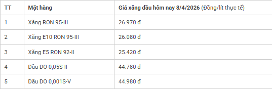 Giá xăng dầu hôm nay 8/4/2026 lúc 4h15 sáng. Bảng giá xăng dầu hôm nay 8/4/2026 từ Petrolimex, PVOIL, Mipecorp, Thalexim…